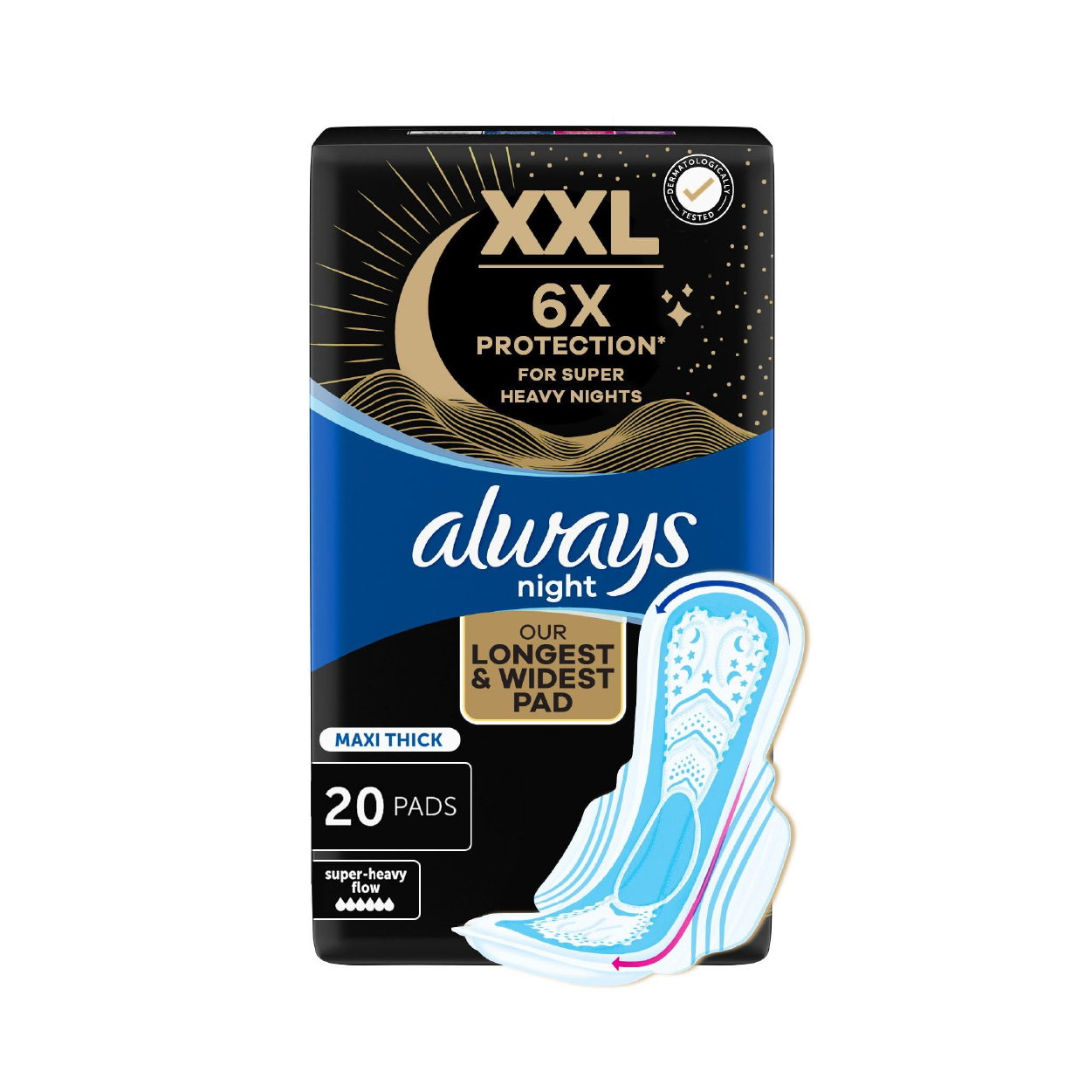 Always Heavy Nyt Pads 20'S (Blk/Purple) are designed to provide peace of mind and comfort during your heaviest flow. These pads are specially crafted to absorb quickly and lock away moisture, keeping you dry and comfortable no matter the activity.
